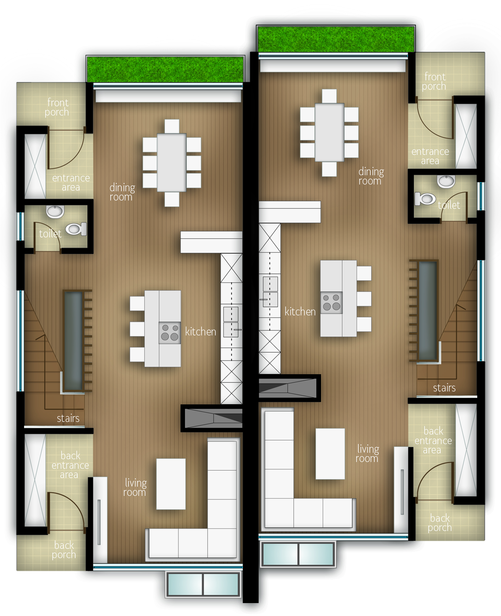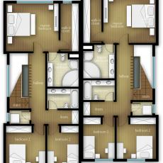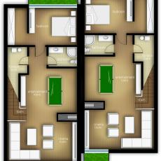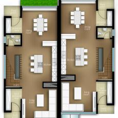 Each modern unit has a developed basement a ground floor and a second floor. The layout is organized in a manner that allows maximum usage of natural light within the depth of the units. The project tends to use the width of each unit to the fullest in order to obtain larger functional living space on each floor. Extensive use of cantilivers provides roomy and cosy bedroom setting.